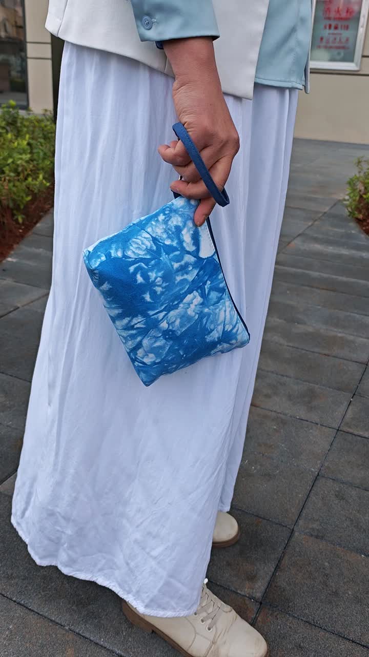 Muestre la funcionalidad de este bolso de maquillaje de mano teñido anudado