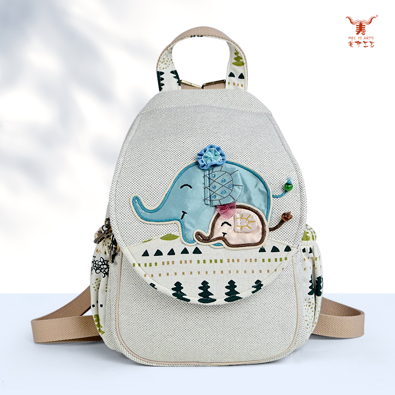 Demuestre completamente las funciones y la estructura de esta mochila personal de lino y algodón con forma de elefante.